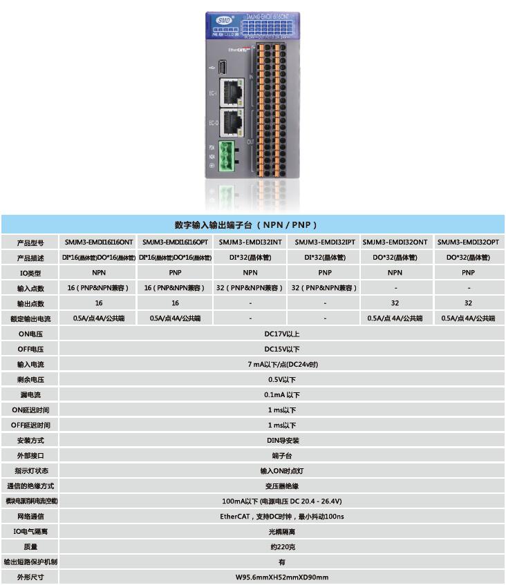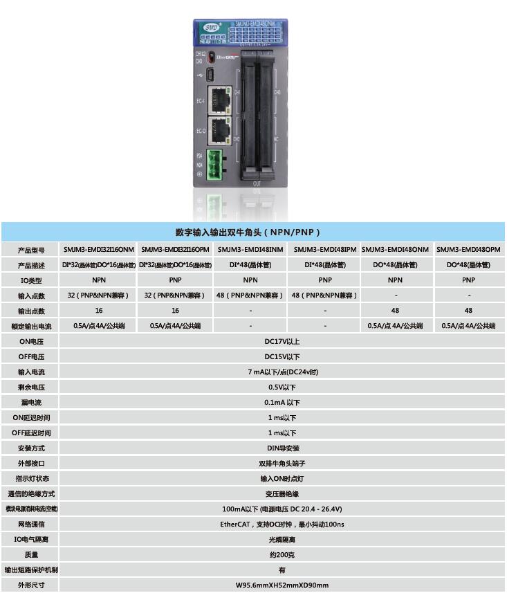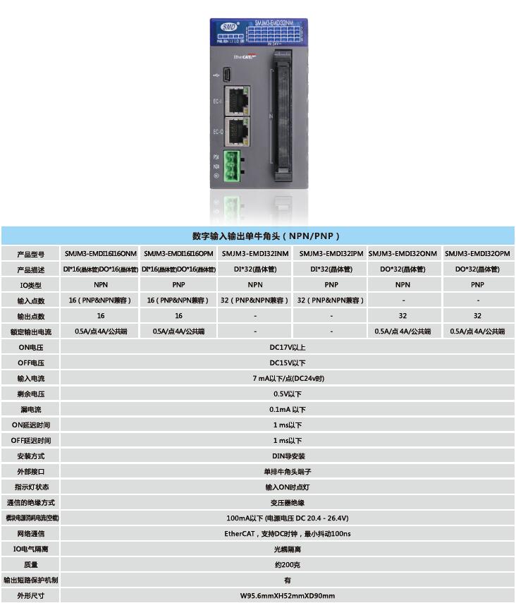 少點(diǎn)數(shù)及多點(diǎn)數(shù)遠(yuǎn)程IO是速美達(dá)自主研發(fā)的一款總線產(chǎn)品。將通訊端口,電源模塊,IO模塊集成在單個(gè)模塊上。其擁有體積小、結(jié)構(gòu)緊湊、 接線簡(jiǎn)單、 接線接口豐富、 性能穩(wěn)定、 可靠等特點(diǎn)。目前支持EtherCAT 總線,后續(xù)會(huì)增加CC-LINK,PROFINET等總線接口。有多種型號(hào)類型以及輸入輸出點(diǎn)可供選擇,單個(gè)模塊最大可支持48個(gè)信號(hào)點(diǎn)。