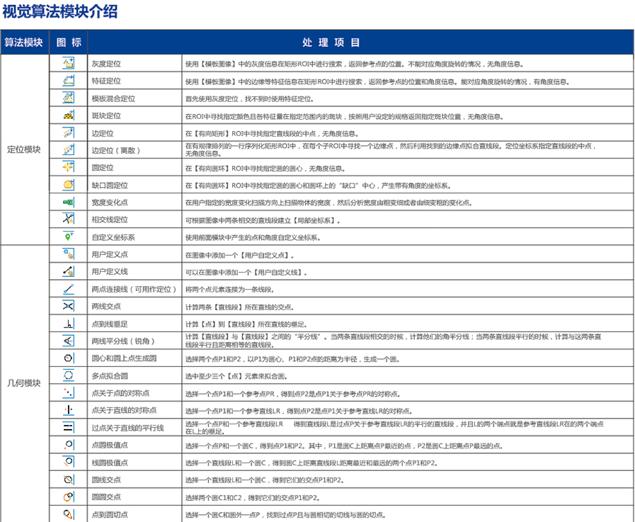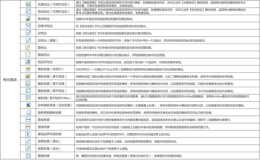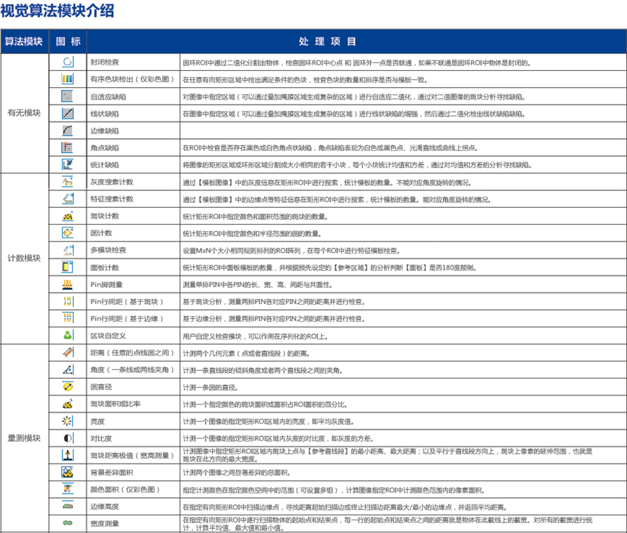 模塊化設(shè)置簡單快捷,快速對應(yīng) ,我們也可以根據(jù)客戶的實際需求,進行新模塊的定制研發(fā)及實施。系統(tǒng)設(shè)定好相機觸發(fā)模式,并采集好圖像后,按照軟件的工作流程和邏輯,可從算法庫中選擇需要的模塊對圖像進行處理分析,然后將處理結(jié)果以網(wǎng)絡(luò)、串口或IO通訊的方式發(fā)送給客戶端及執(zhí)行機構(gòu)。