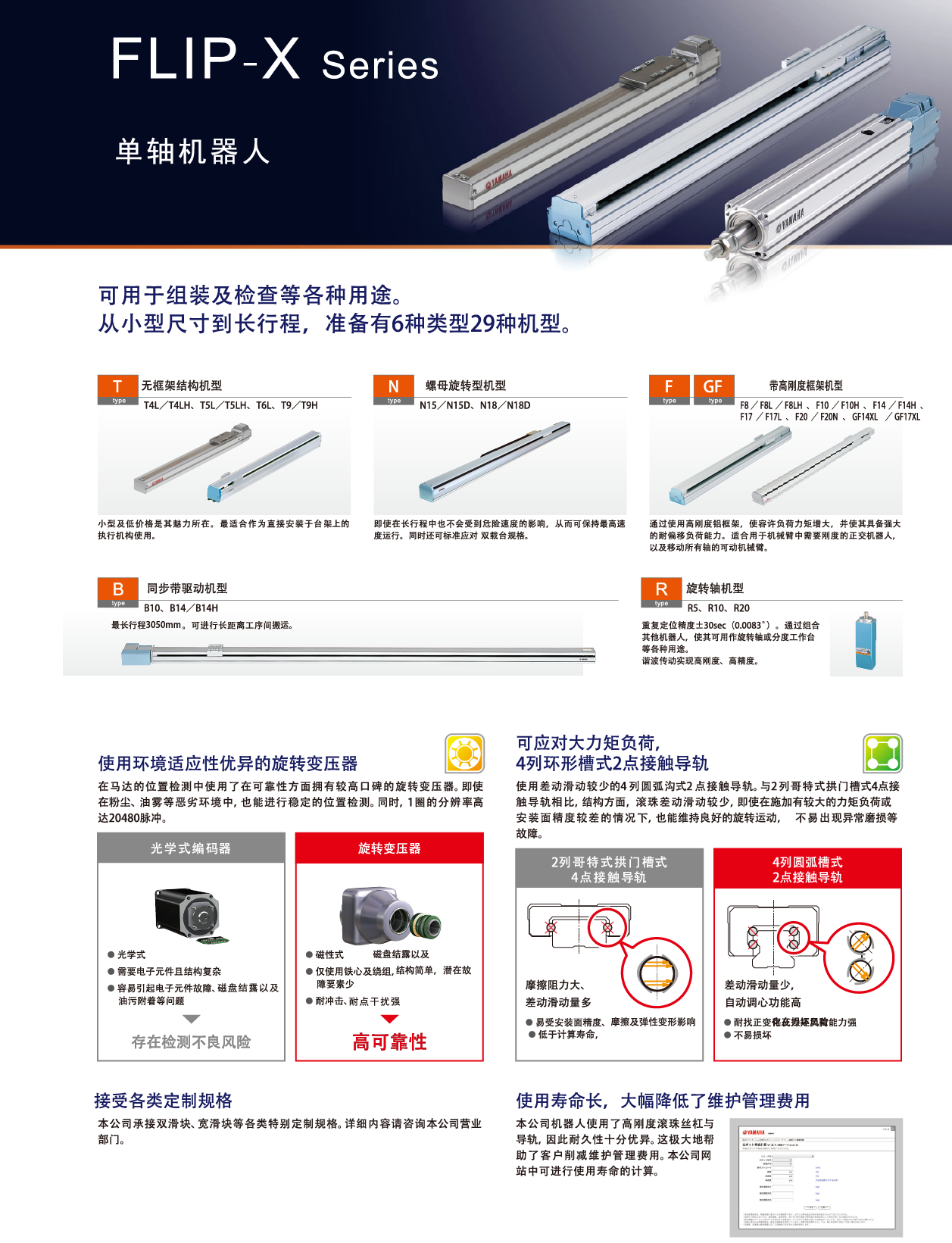 利用高剛性的滾珠絲杠與導(dǎo)軌,位置檢出器采用耐環(huán)境性極高的旋轉(zhuǎn)變壓器,因而它具有產(chǎn)品使用壽命長(zhǎng)的特點(diǎn)??捎兄蠓冉档途S護(hù)管理費(fèi)用。