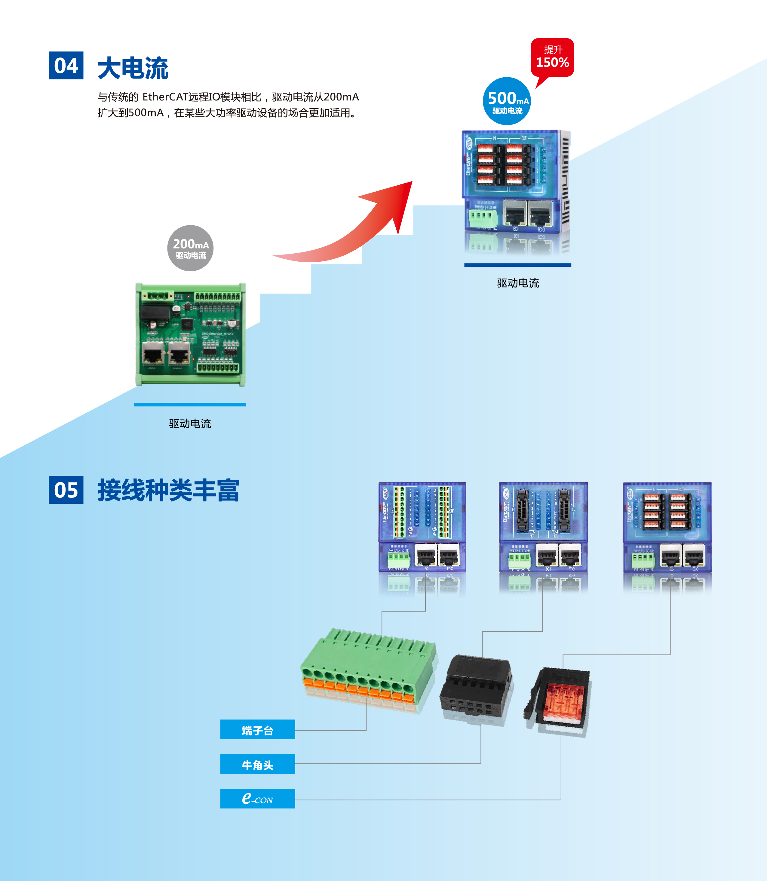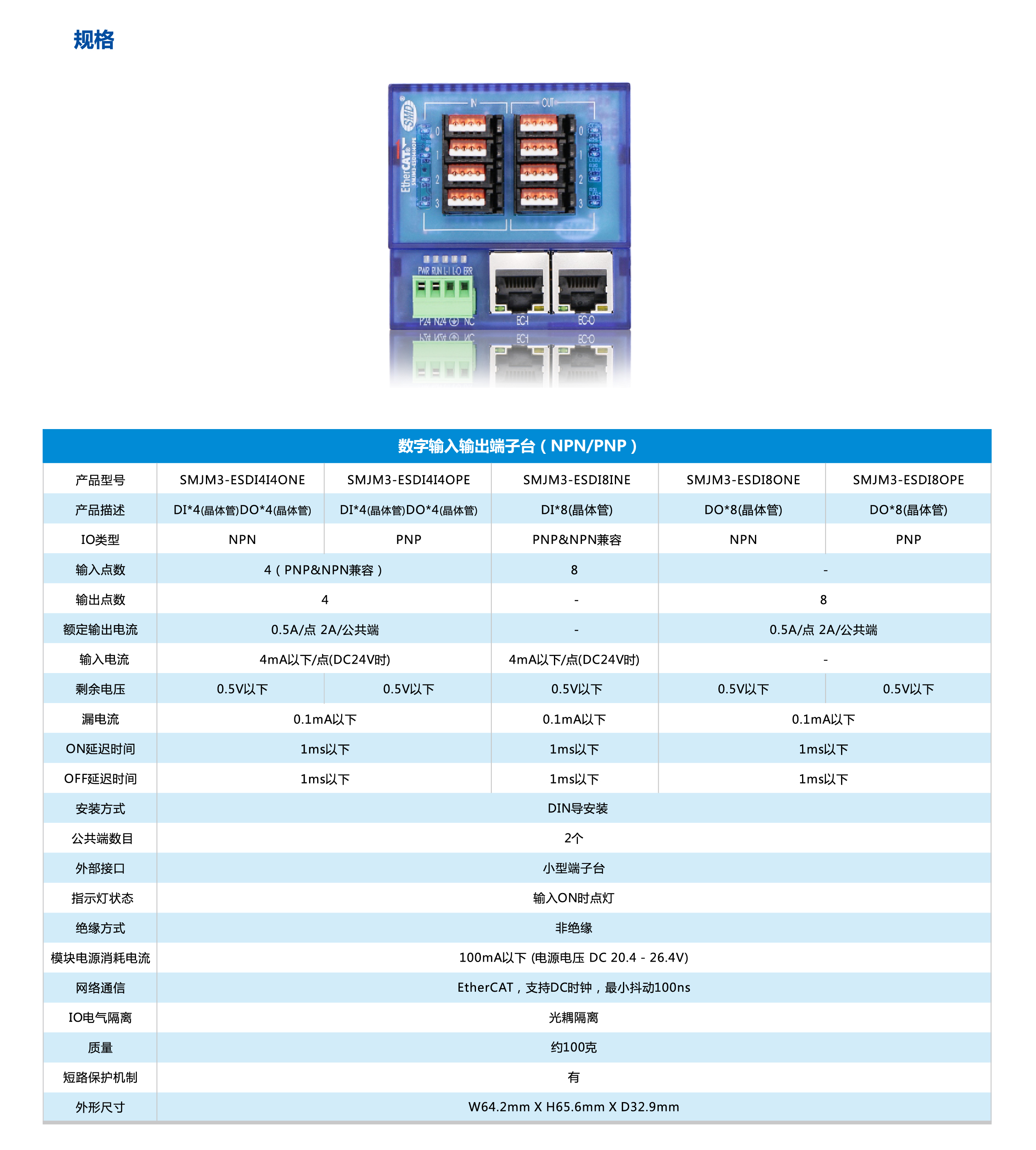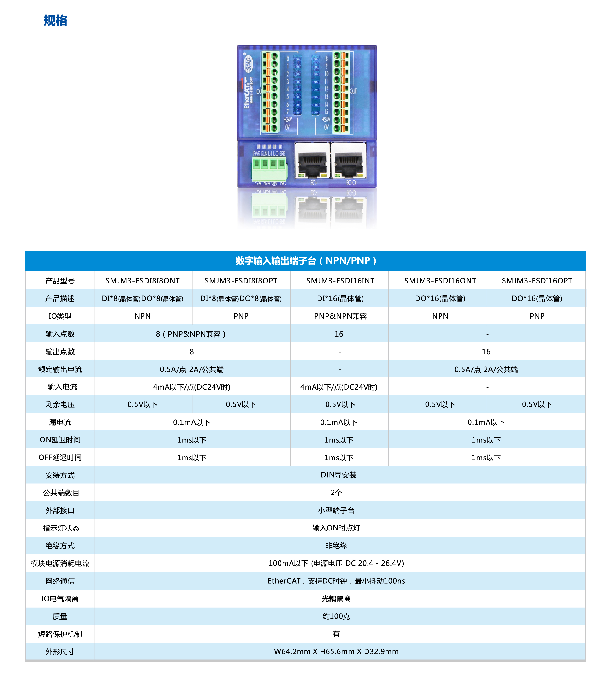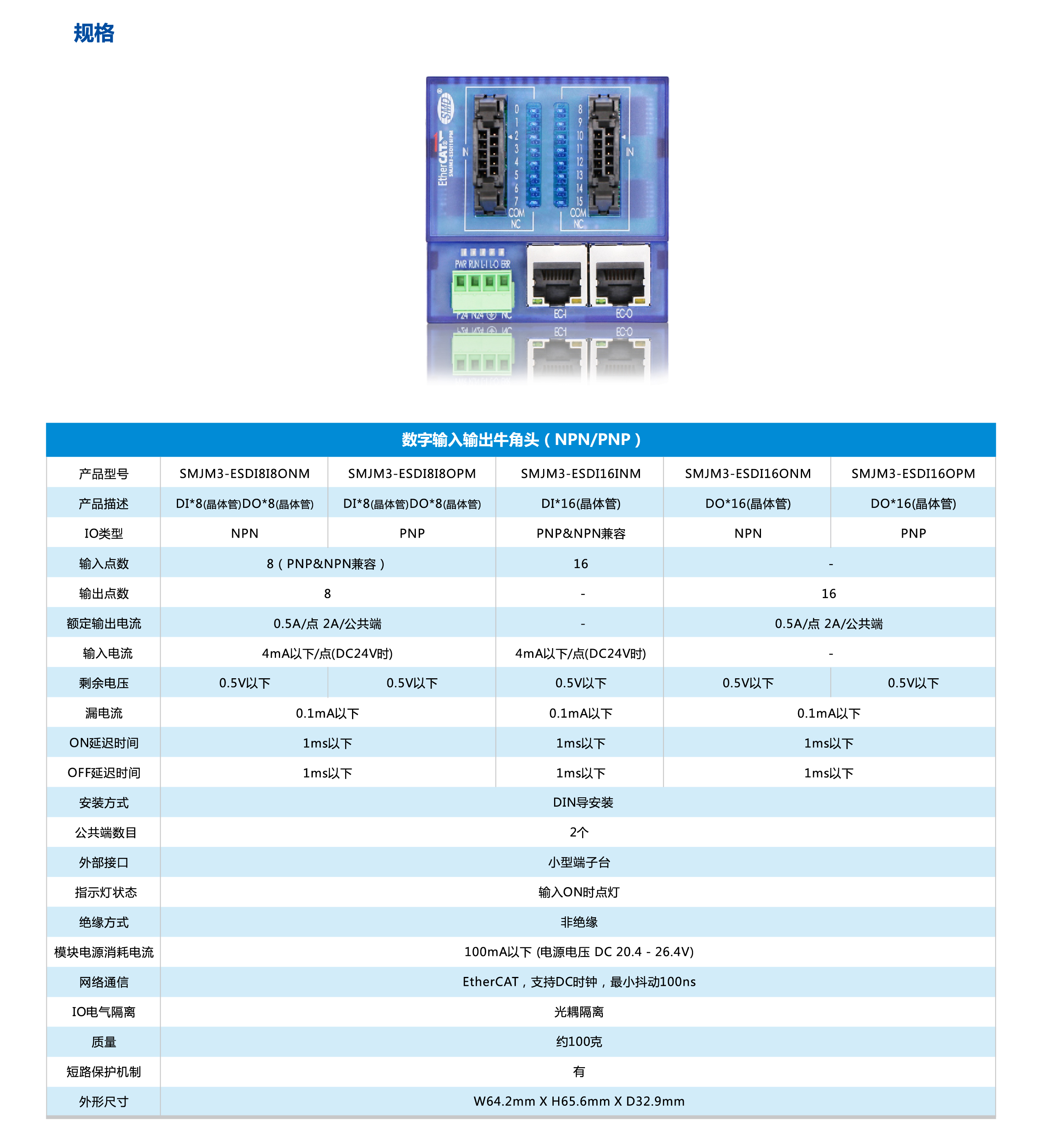 少點數(shù)及多點數(shù)遠(yuǎn)程IO是速美達(dá)自主研發(fā)的一款總線產(chǎn)品。將通訊端口,電源模塊,IO模塊集成在單個模塊上。其擁有體積小、結(jié)構(gòu)緊湊、 接線簡單、 接線接口豐富、 性能穩(wěn)定、 可靠等特點。目前支持EtherCAT 總線,后續(xù)會增加CC-LINK,PROFINET等總線接口。有多種型號類型以及輸入輸出點可供選擇,單個模塊最大可支持48個信號點。