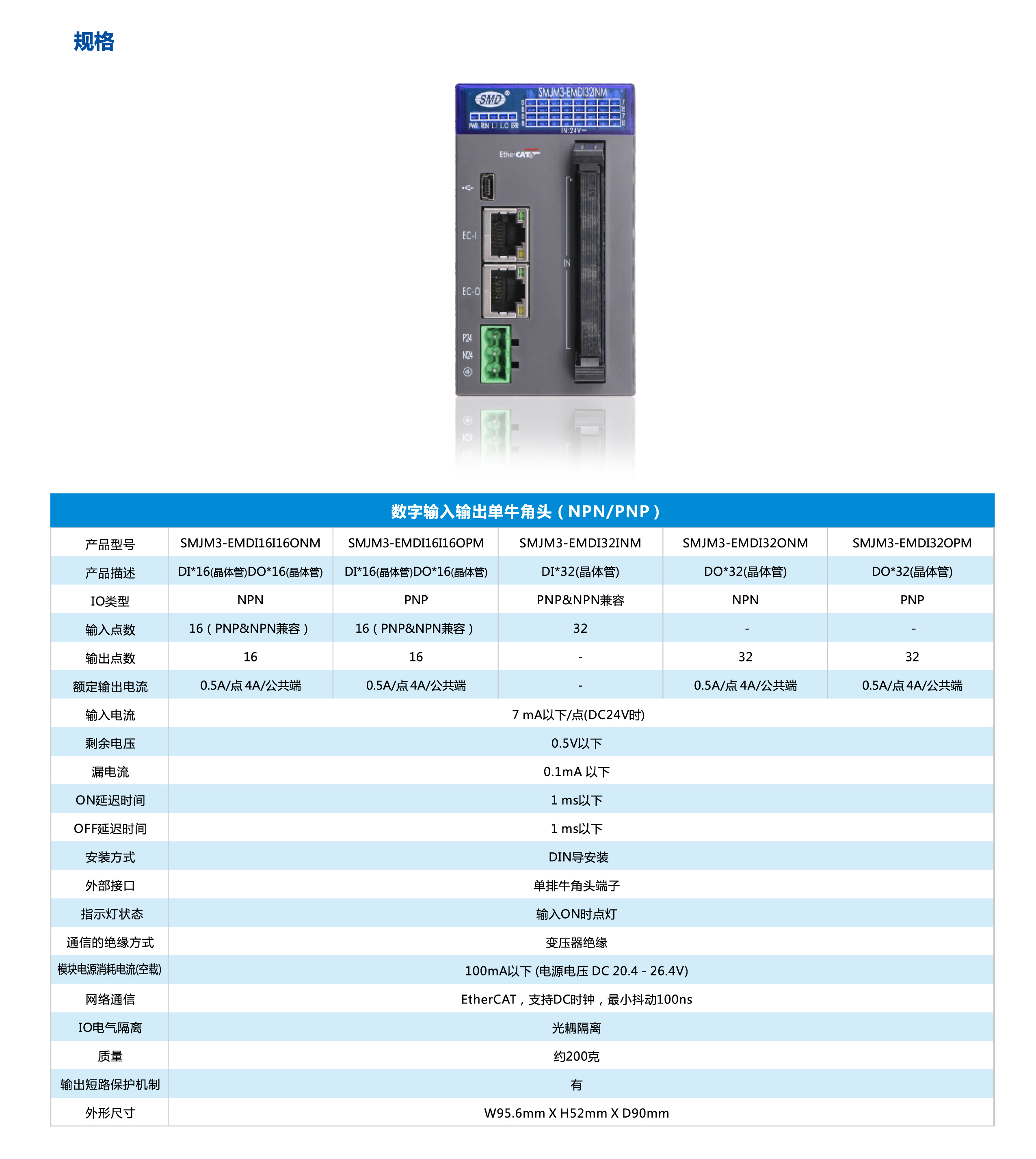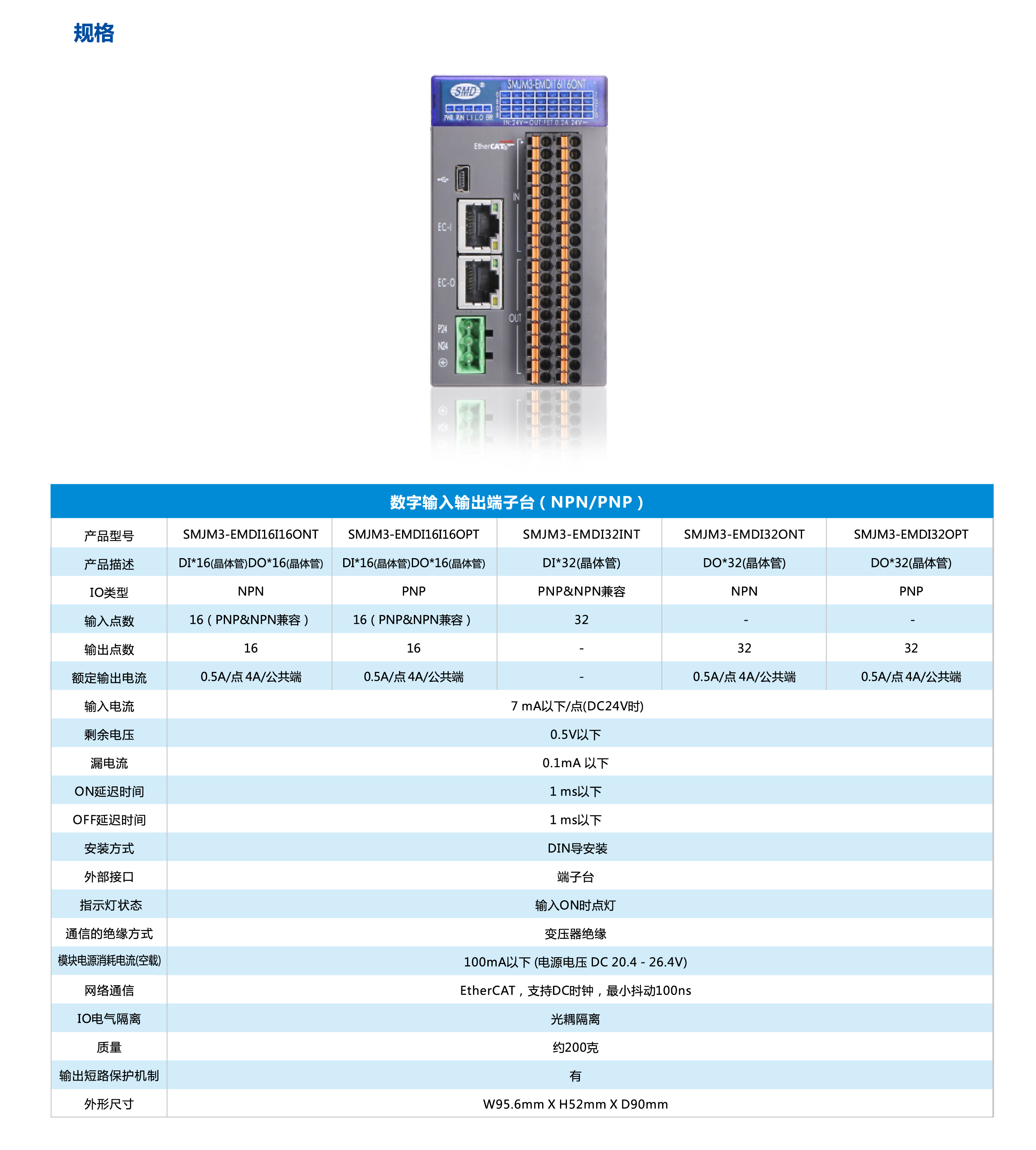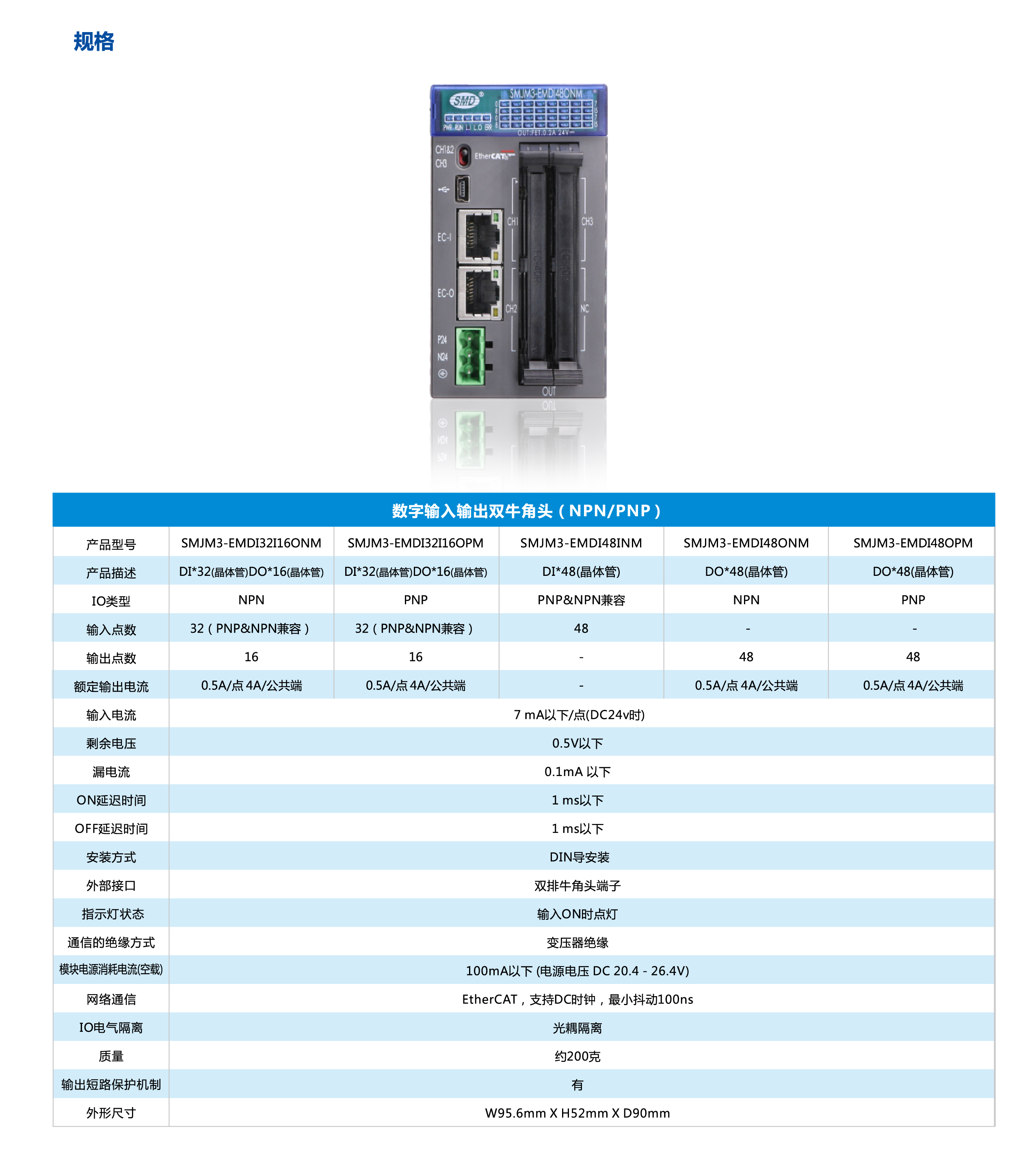 少點(diǎn)數(shù)及多點(diǎn)數(shù)遠(yuǎn)程IO是速美達(dá)自主研發(fā)的一款總線產(chǎn)品。將通訊端口,電源模塊,IO模塊集成在單個模塊上。其擁有體積小、結(jié)構(gòu)緊湊、 接線簡單、 接線接口豐富、 性能穩(wěn)定、 可靠等特點(diǎn)。目前支持EtherCAT 總線,后續(xù)會增加CC-LINK,PROFINET等總線接口。有多種型號類型以及輸入輸出點(diǎn)可供選擇,單個模塊最大可支持48個信號點(diǎn)。