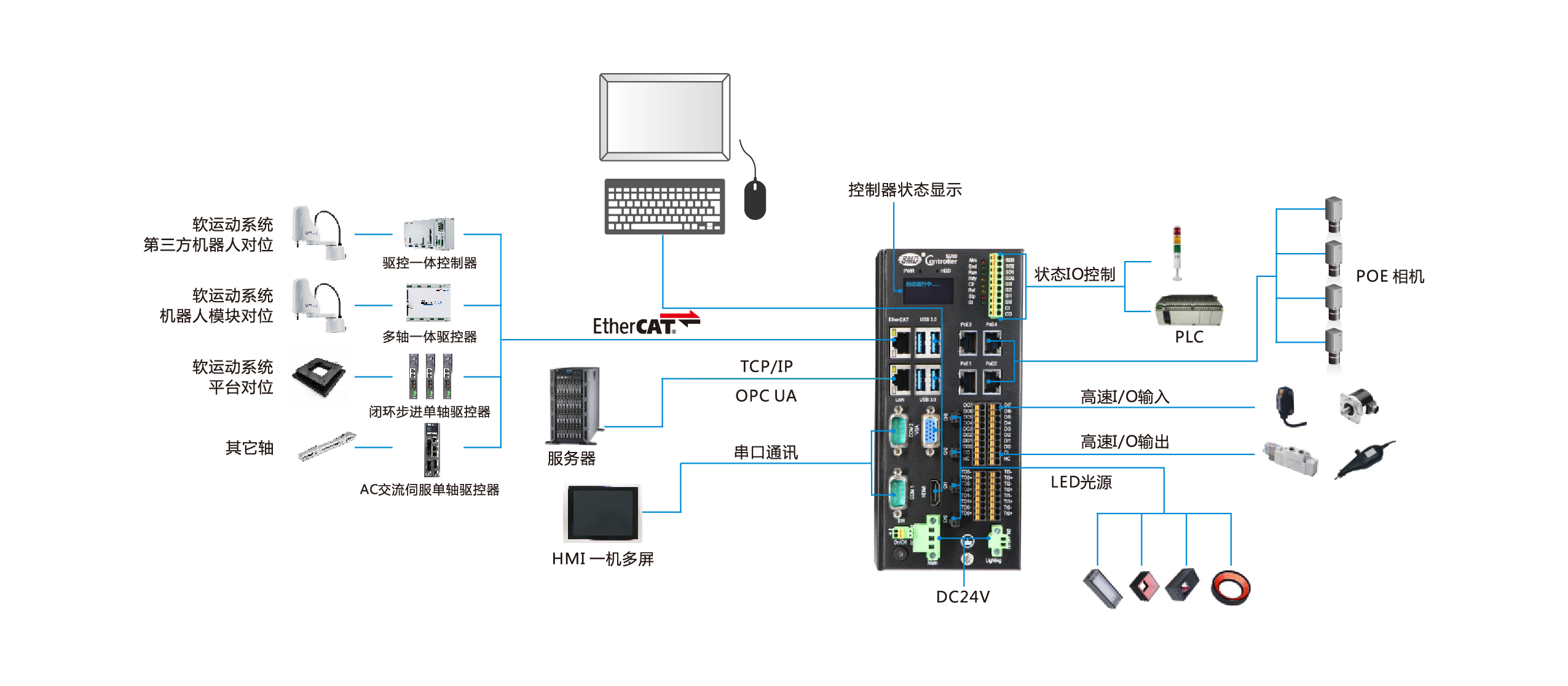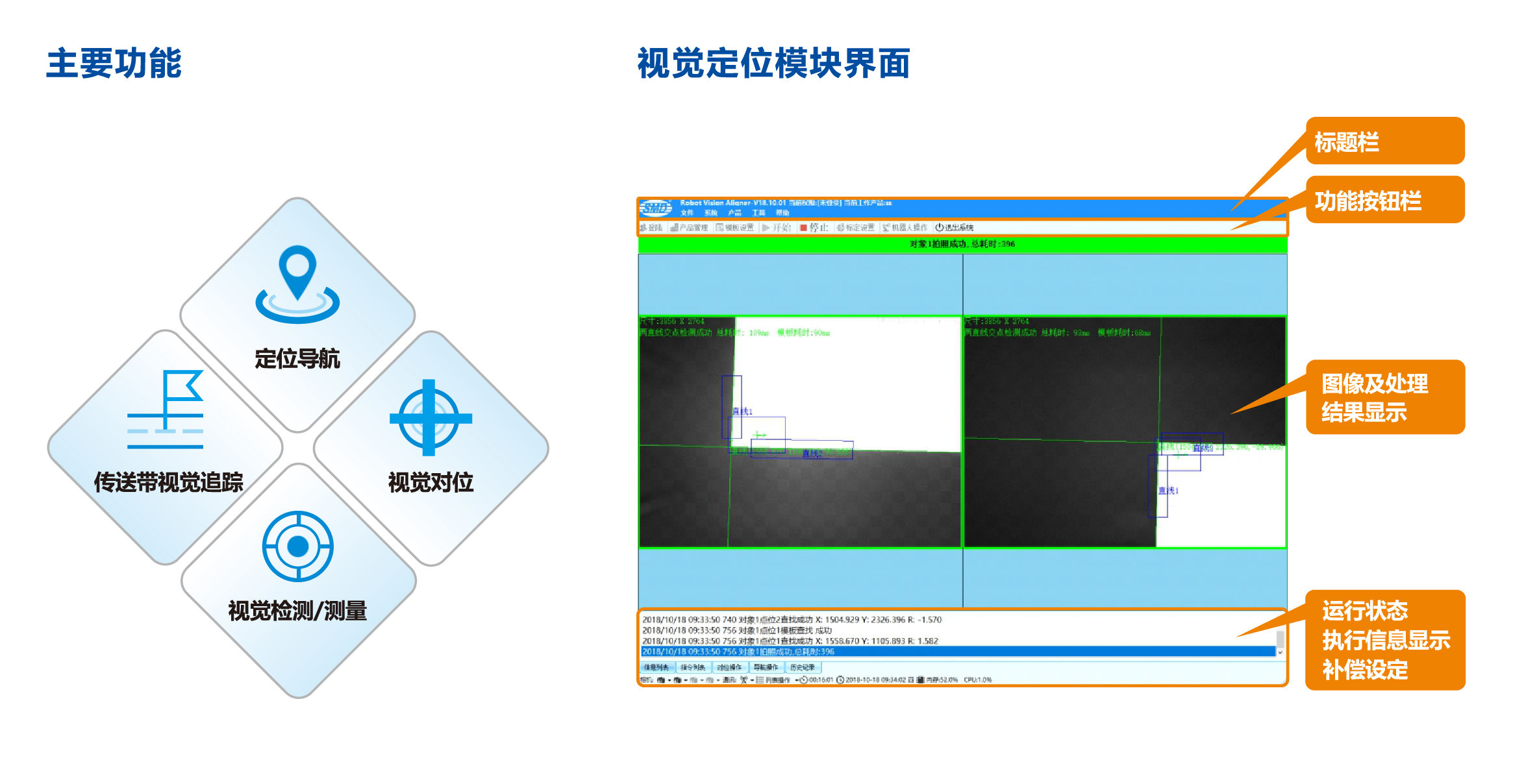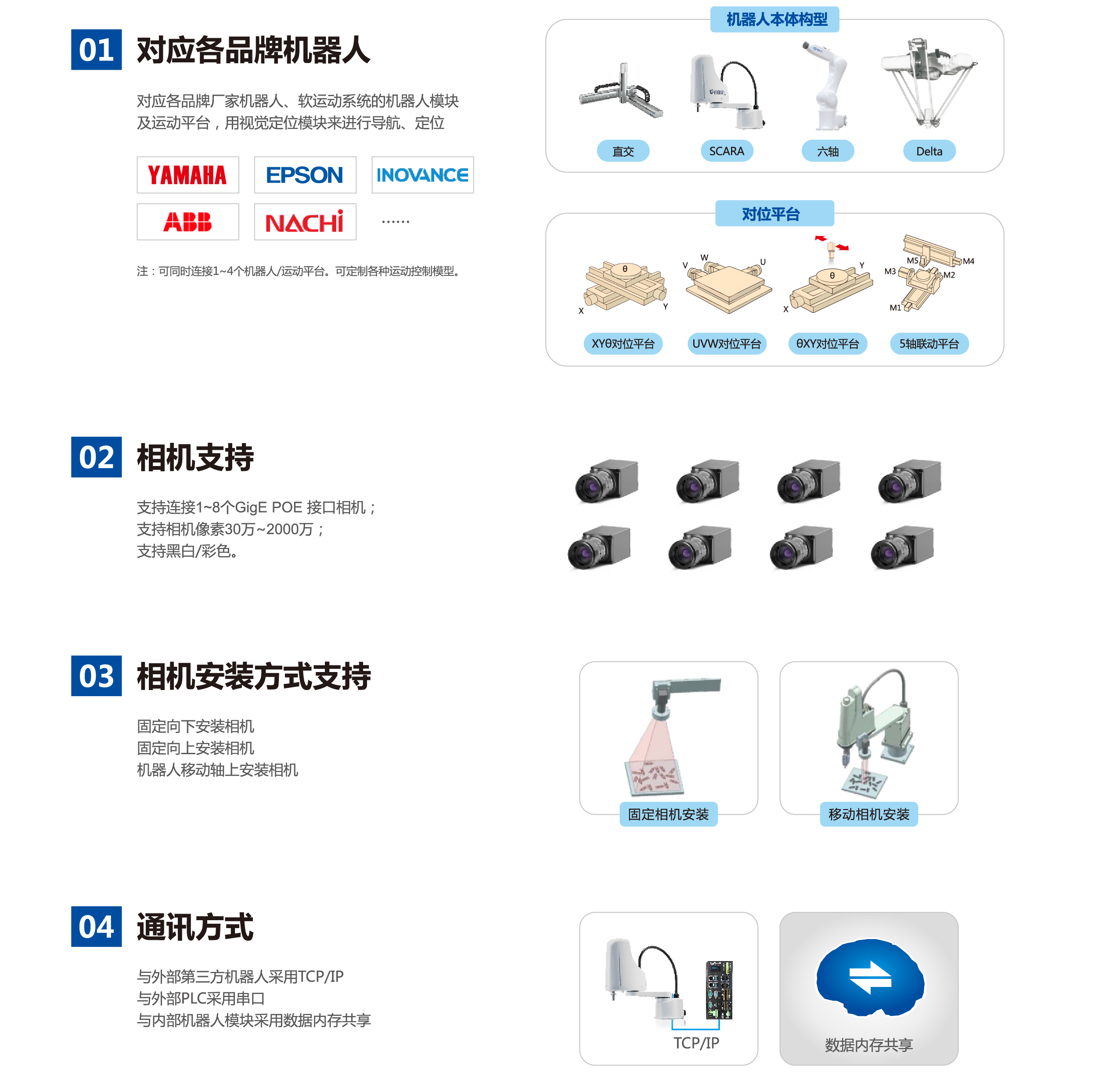 多種多樣的圖像處理功能與視覺定位對位功能,滿足各種各樣的定位對位需求及簡易測量、 檢測、 識別等需求,不僅功能豐富還可以根據(jù)客戶需求進行功能定制。 多種定位對位補償算法,補償自動計算,大大節(jié)約調(diào)試時間。 多種通訊方式,滿足不同類型的通訊需求。 支持幾乎所有類型的工業(yè)機器人及運動平臺的構(gòu)型。