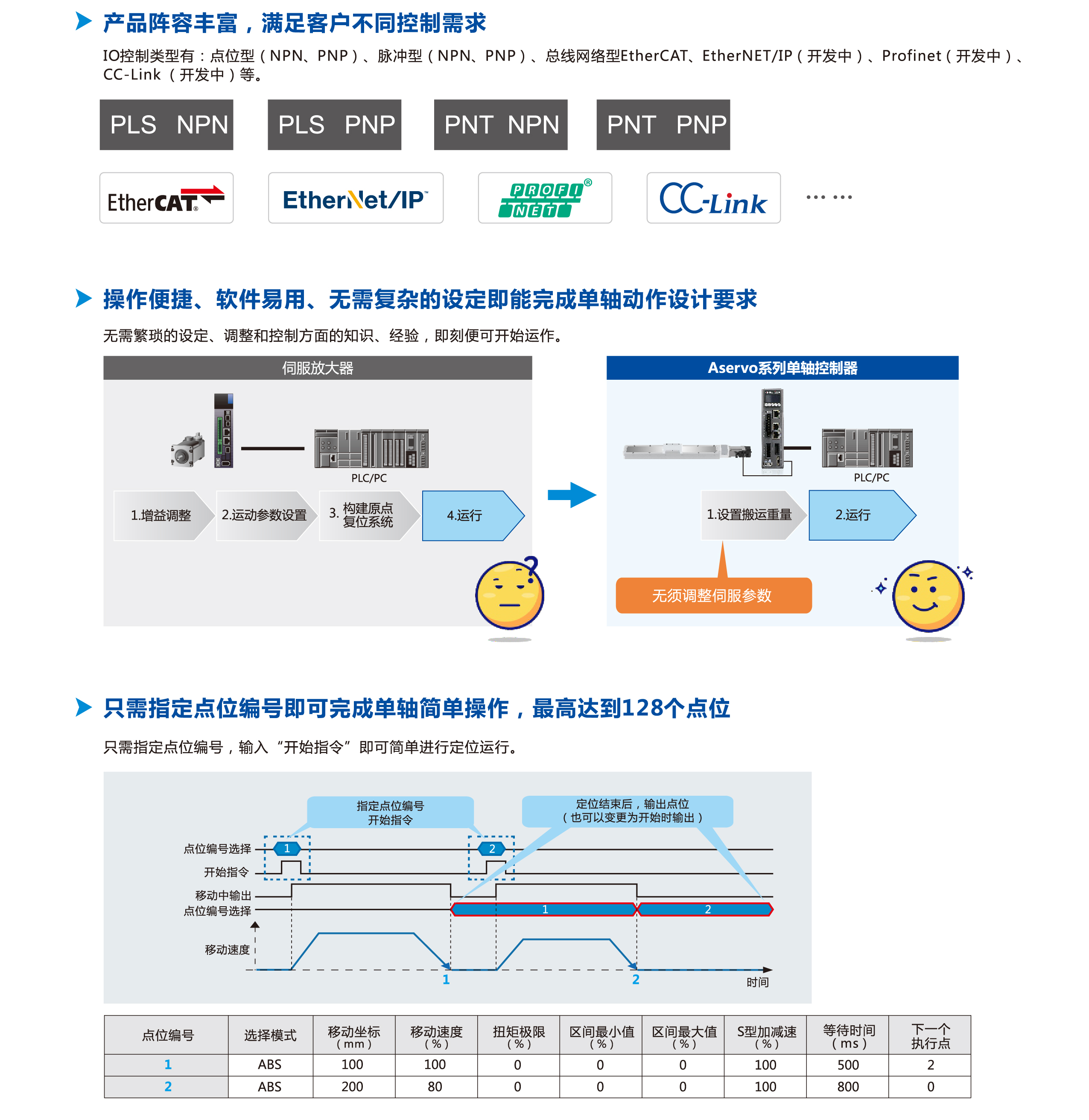 Aservo系列交流伺服單軸控制器是完全自主研發(fā),并匹配單軸應(yīng)用功能的產(chǎn)品。 高亮度OLED顯示加上輕觸按鍵完成人機(jī)操作,可根據(jù)單軸負(fù)載大小來(lái)自動(dòng)配置最適合機(jī)器人的伺服參數(shù)和加速度模式,特別是EtherCAT高速通訊網(wǎng)絡(luò)版本,更優(yōu)化整合到軟運(yùn)動(dòng)控制系統(tǒng)之中,簡(jiǎn)單易用,給客戶(hù)帶來(lái)舒適流暢的體驗(yàn)!