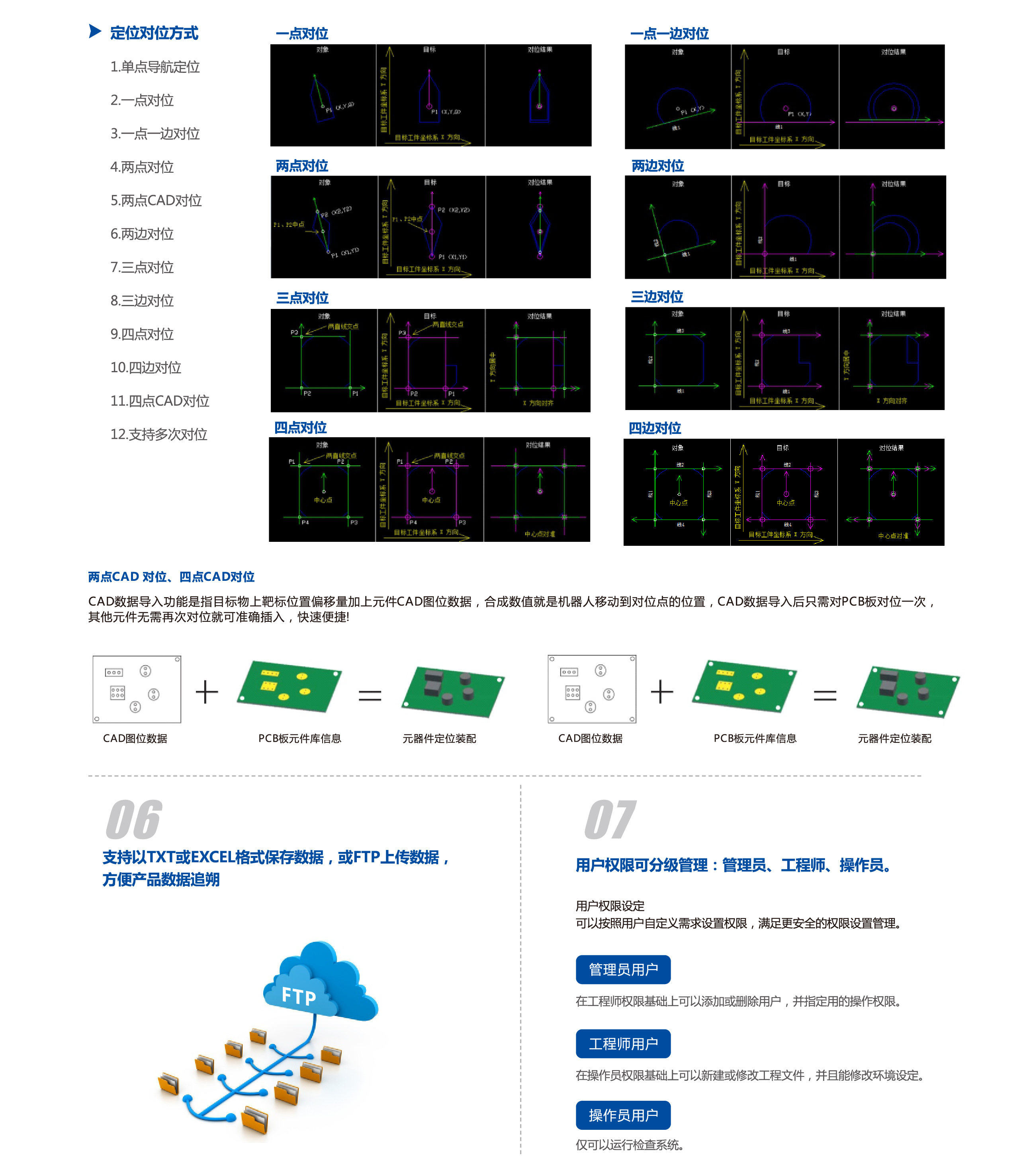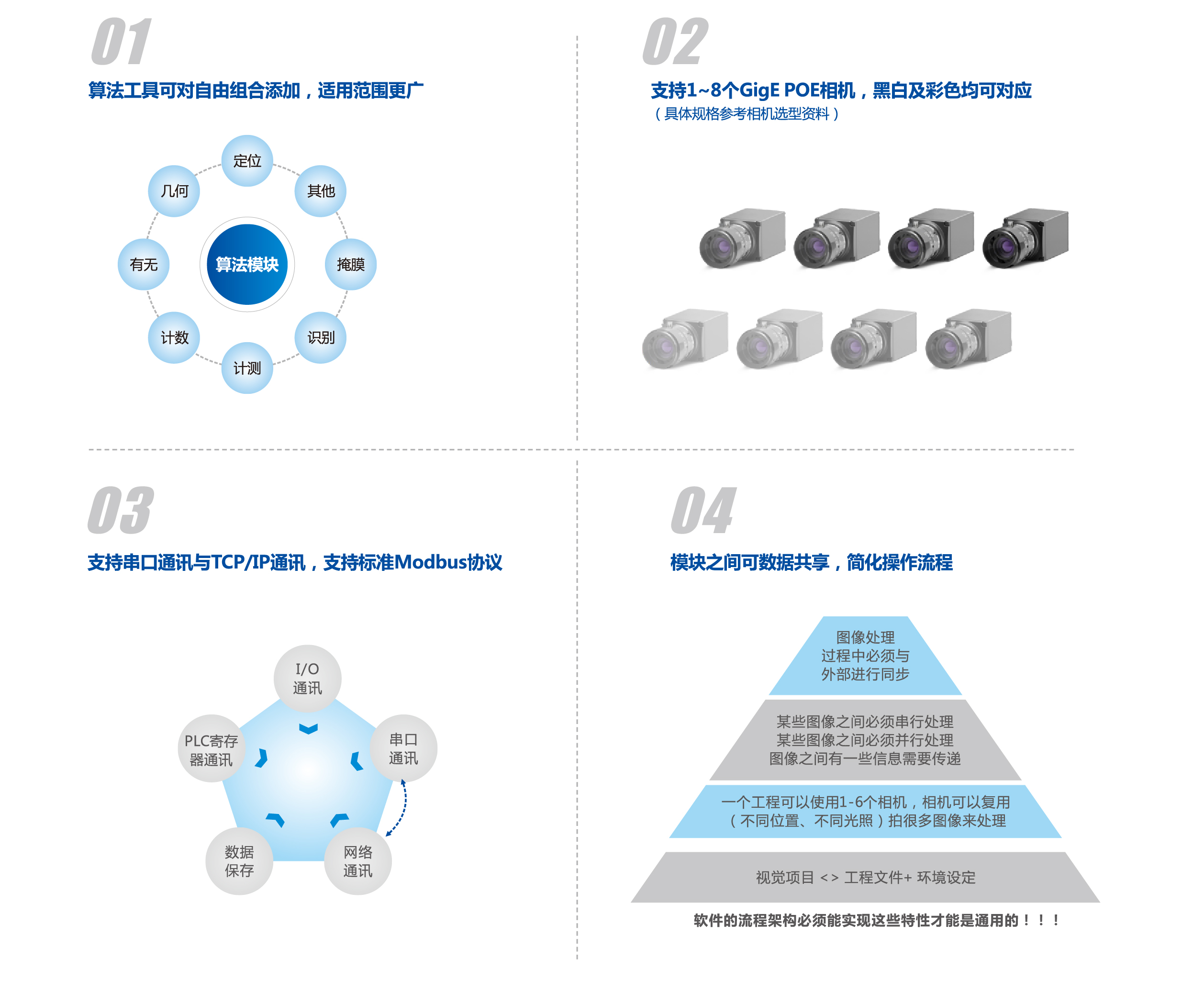 模塊化設(shè)置簡單快捷,快速對(duì)應(yīng)。 多種多樣的圖像處理功能與視覺對(duì)位功能,滿足多種多樣的定位對(duì)位、 測(cè)量、 識(shí)別等需求,多種定位對(duì)位補(bǔ)償算法,大大節(jié)約調(diào)試時(shí)間。 多種通訊方式,滿足不同類型的通訊需求。